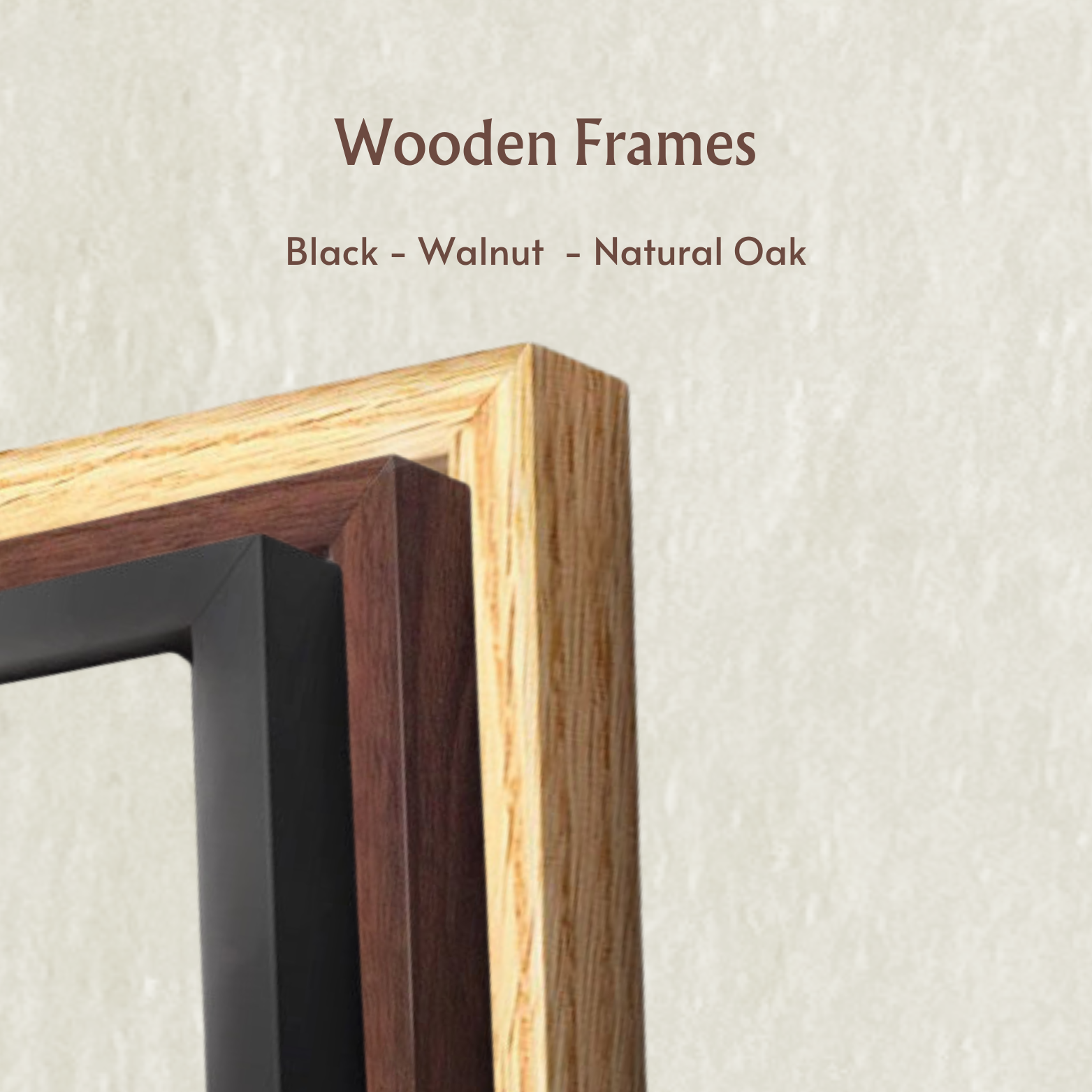 Frames come in Natural Oak, Black, and Walnut options. Sizes range from 8x10 - 40x60 (all sizes in inches).