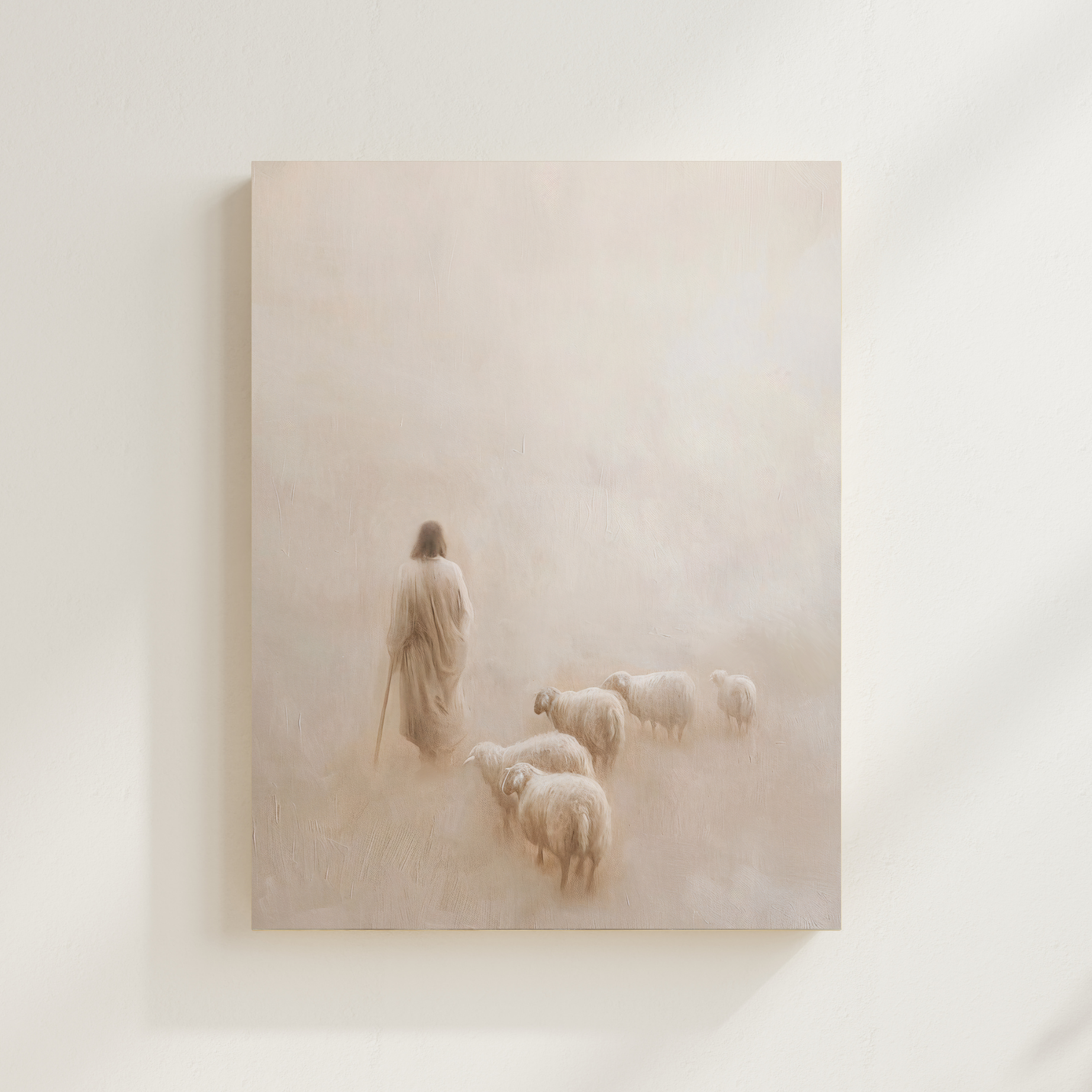 Bring peace and comfort into your home with Gentle Shepherd. This fine art print shows Jesus as the Good Shepherd, tenderly leading His flock with love and care. Inspired by John 10:11, it reflects His nearness, His steady voice, and His faithful presence in every season.